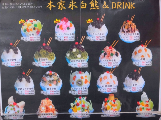 こちらの「天文館むじゃき 本店」、1階が「白熊菓琲」というカフェになっております。ハンディ白熊は5種類でしたが、店内ではもっとたくさんの白熊があります。「南海の黒熊」や「焼酎みぞれ」など、気になる名前も・・・!
