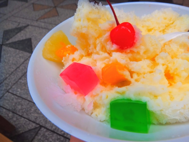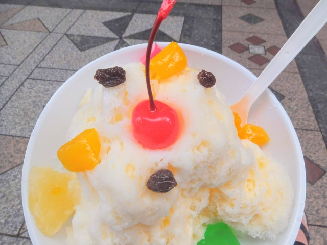白熊の魅力といえばたっぷりなトッピング。さくらんぼやパイナップルなどのフルーツ、カラフルな寒天がどっさりと乗っています。味はもちろん、それぞれ異なる食感は楽しさもプラスしてくれます。