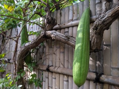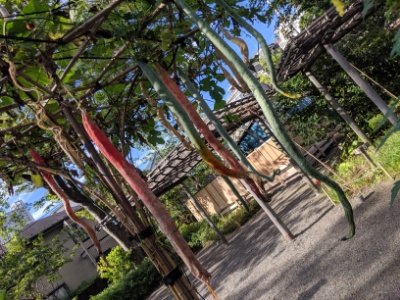 にょろんと伸びた不思議な果実が垂れ下がる。こちらはヘビウリという、インドから来た植物。1m近い長い果実が、その名の通りヘビのように垂れ下がっています。