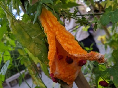 最終形態を迎えたゴーヤ。オレンジ色に変色した実ははじけ、赤い種が見えています。この成熟した種はとても甘いらしい。