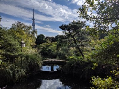 江戸時代に佐原鞠塢(さわらきくう)という人物がこの土地を購入し、梅を植えた「新梅屋敷」が百花園のはじまり。その後、空襲で消失するも、人々の努力で復元。現在に至ります。園内から見えるスカイツリーは新しい形の借景でしょうか。※借景=庭園の外にある山や城などを、背景として取り込み景観を作る手法のこと。