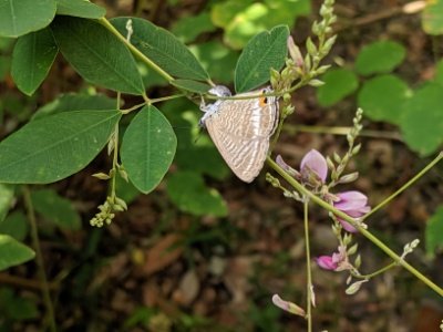 小さくひらひら飛んでいるのはウラナミシジミ。波のような模様と、オレンジがかったポイントが目印。シジミチョウはなかなか花に止まらず、またすぐに飛び立ってしまうので写真に撮るのがとても難しい。