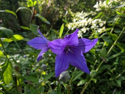 濃い紫の花を咲かせるのは、秋の季語でもおなじみのキキョウ。星型の花は、明智氏の家紋でもおなじみです。
