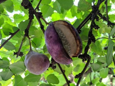 縦に割けた実はミツバアケビ。そのまま食べることもできるそう。