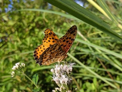 植物が多いということは、もちろん昆虫もたくさん。ツマグロヒョウモンかと思われる蝶は、かなり近づいても逃げません。ちなみにこの蝶のサナギは、ハンダ付けのようなメタリックな突起があります。
