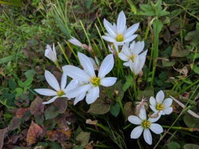棒のような葉に囲まれているタマスダレ。ヒガンバナ科の植物で、白い花弁と黄色いのくっきりとしたコントラストがキレイ。学名は「ゼフィランサス」。この名前を聞くと、頭の中に0083の数字が浮かぶ方も多いのでは。