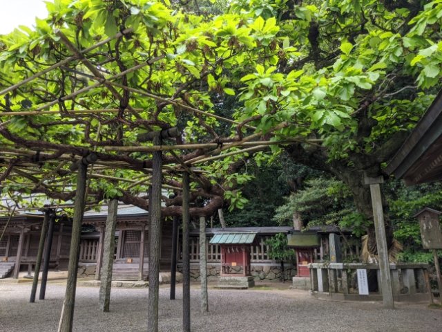 御神木は楢(なら)。樹齢は550年といわれており、まるで生き物のように枝を伸ばしています。神紋のうち表紋は菊の御紋ですが、裏紋は楢の葉をあしらったデザインをしています。