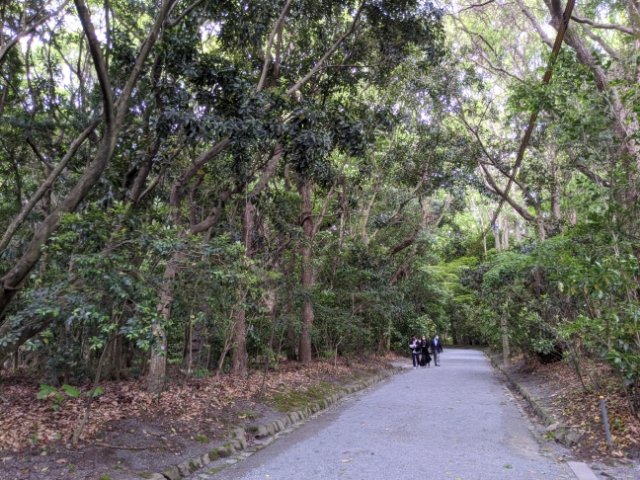 拝殿向かって右側には高宮参道の入り口。鎮守の森の中を通る道となっており、木々のざわめきと砂利を踏む音が響きます。