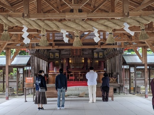 鳥居をくぐるとすぐに本殿へ。現在の社殿は1578年に再建されたもの。450年ほどの月日を経た木造建築からは、厳かな空気が流れます。