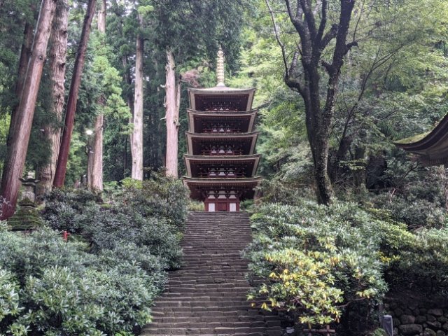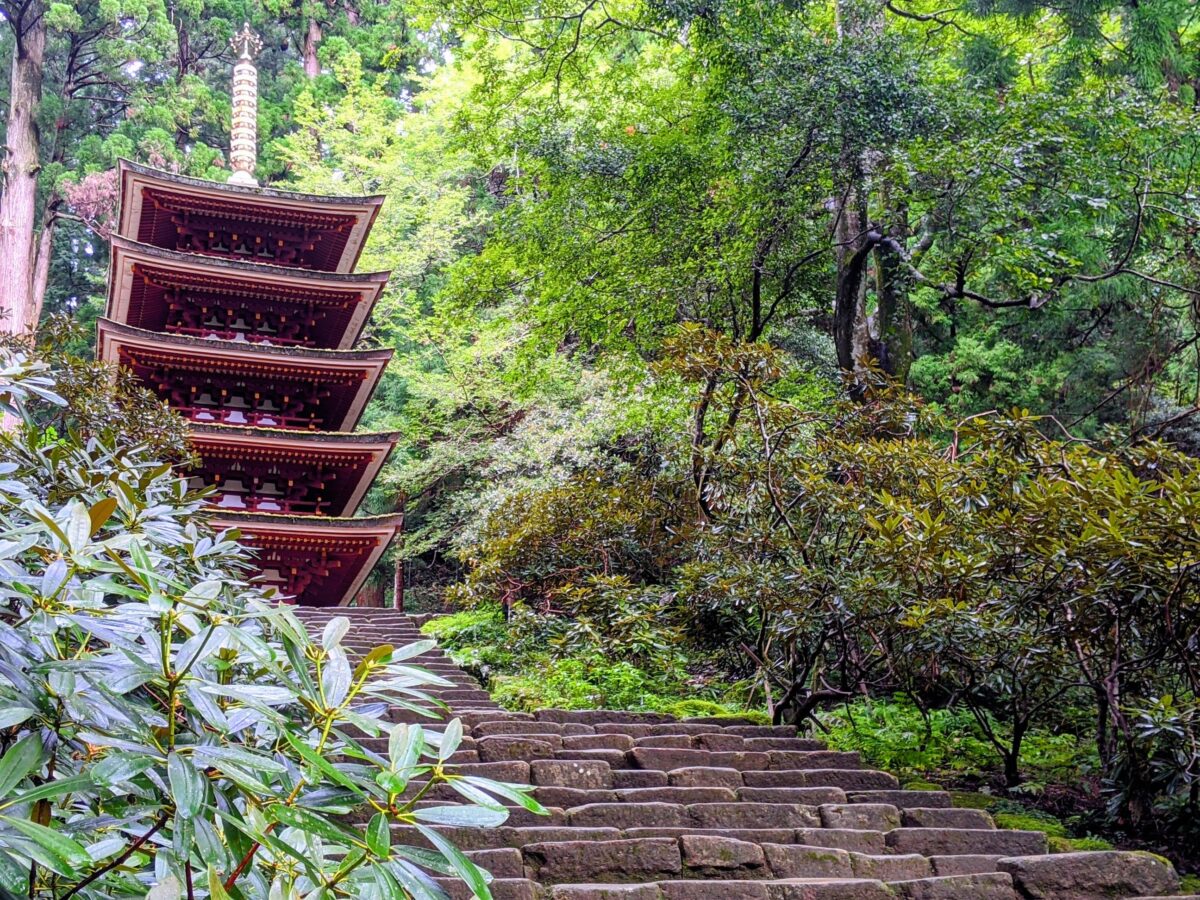 室生寺のシンボルとも呼べるのが、本堂の側に佇む五重塔。石段の奥で木立に包まれる姿は荘厳です。