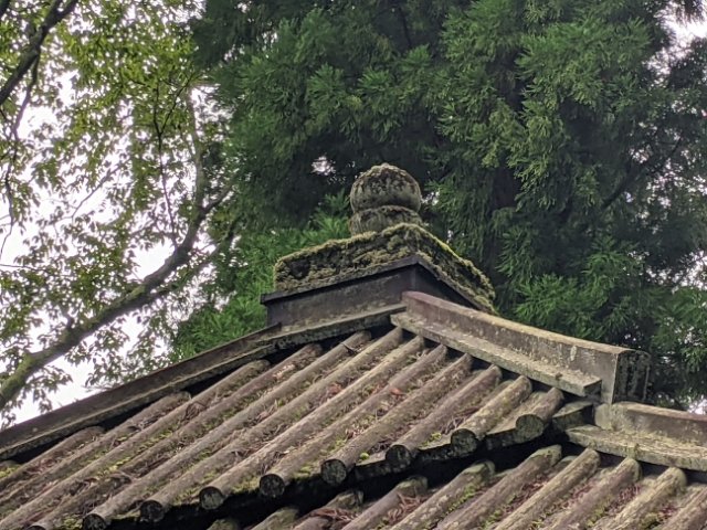 寄棟屋根のてっぺんには、石の置物のようなものが設置されています。こちらは露盤宝珠といわれるもの。飾りであり、雨を防ぐ「雨仕舞い」の効果もあるようです。