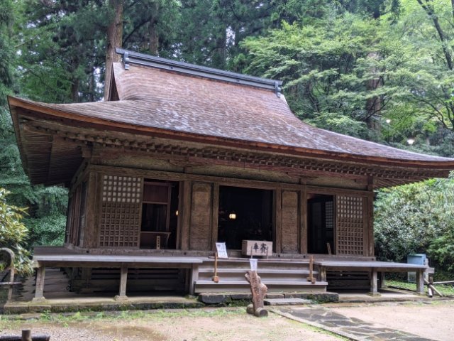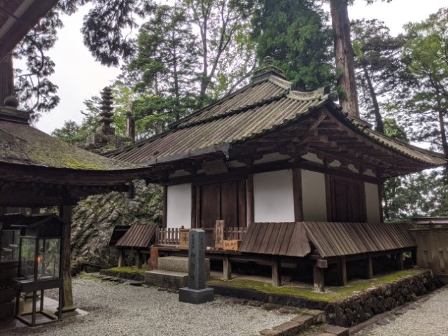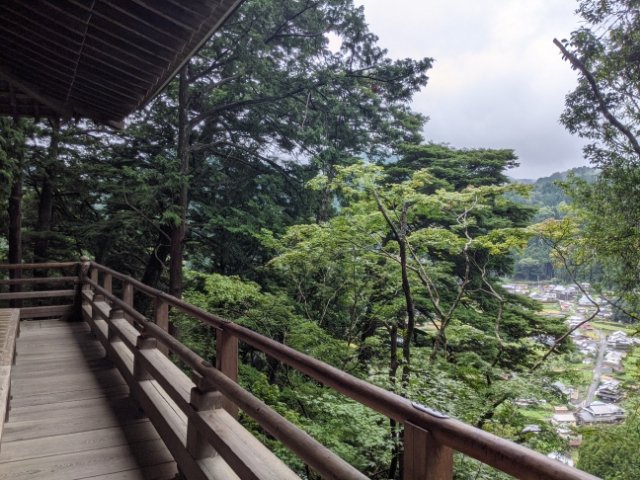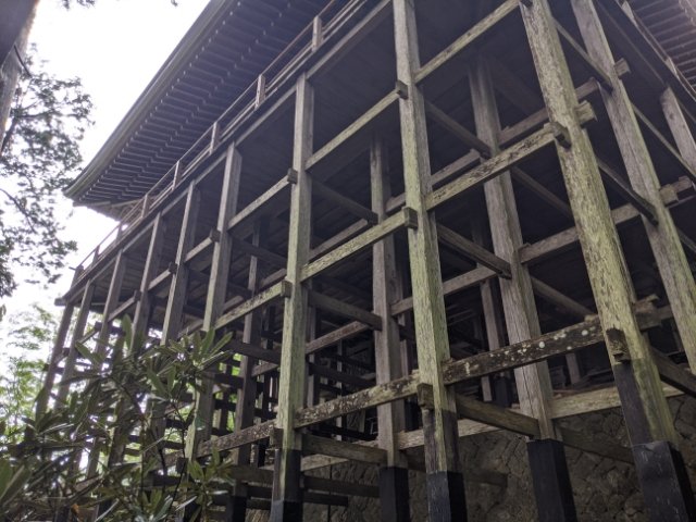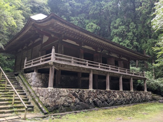 木立の向こうに見えてくる柱で支えられたお堂は、位牌堂。先ほどの金堂よりもはるかにスケールの大きな懸造りで、崖に沿うように柱が連なっています。