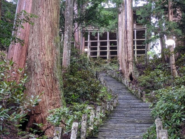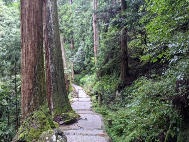 立派な杉の木立に包まれた道は、歩いていると心地よい。砂利と石段で歩きやすくはなっていますが、いったん下った後に上りとなるためなかなかハードな道のり。傾斜はかなり急ですぐに息が上がってしまうため、飲水は持ってきた方が良いです。