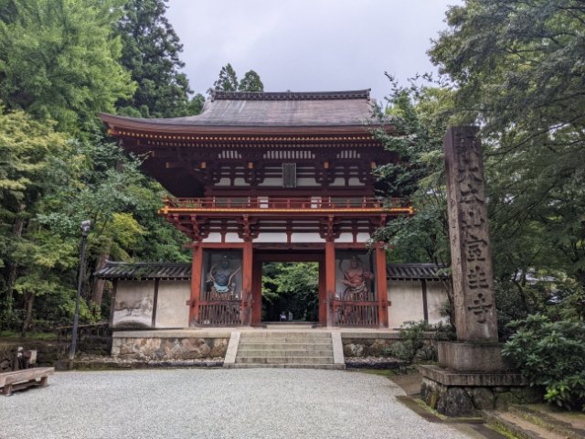 まず目に入るのは大きな仁王門。赤と青の仁王像が、訪れる人に睨みをきかせています。力士像のまわりには、奉納されたわらじがたくさん。