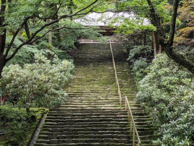 両サイドには肉厚な葉が印象的なシャクナゲがたくさん植えられています。4月中旬~5月中旬にはピンク色の花が、あざやかに石段を彩ります。