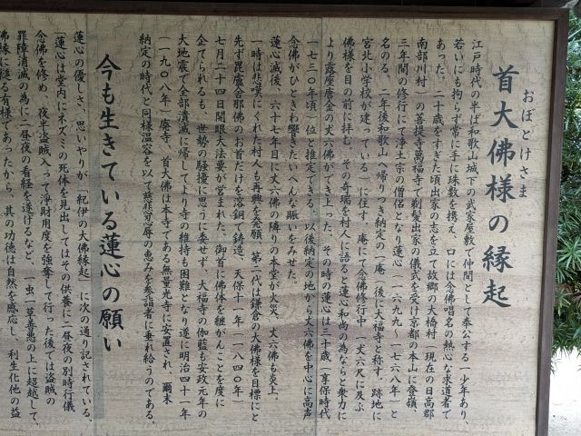 この首大仏、実は2代目の大仏様。最初の大仏は大福寺というお寺に享保年間(1716年〜1736年)に建立されたもので、高さ約4.8mの「丈六仏」であったそう。蓮心という僧侶が念仏修行中に一丈六尺もの仏様を目の前に拝み、その話をきいた村人によって造り上げられます。
