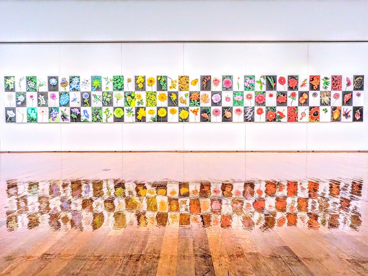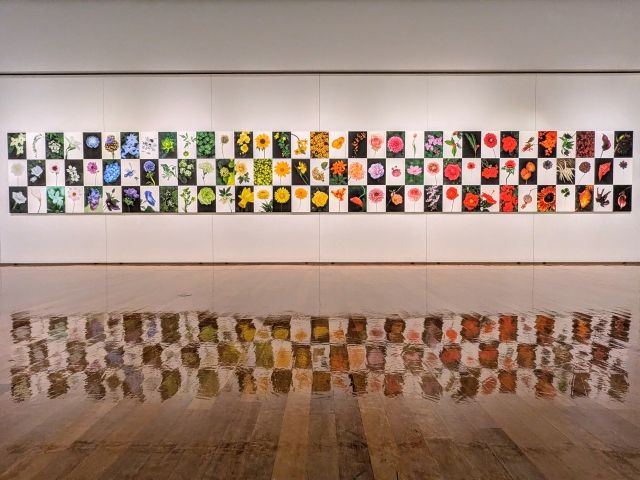 壁一面に展示されている写真は、札幌生まれの写真家によるフォト作品。インクジェットプリントした花の写真がずらりと並びます。縦に統一された色合いは、左右にグラデーションを描いています。背景が無いため絵画にも見えますが、強い照明を当てて背景を飛ばしているそうです。