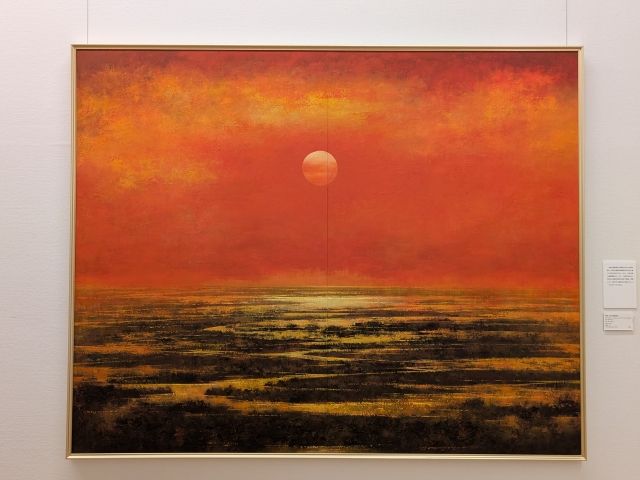 釧路を拠点に活躍した、北海道を代表する日本画家による作品。夕陽が沈みゆく釧路湿原が描かれたダイナミックな作品です。近くで見ると、真っ赤に染まる空は多層で塗り重ねられており、湿原部分の黒褐色はかなり厚塗り。立体感のある作品です。