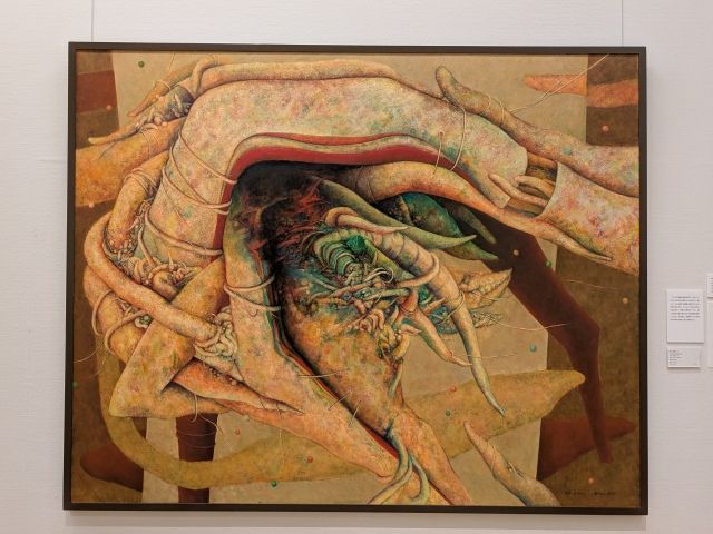 七飯町生まれの画家による絵画。不思議な生き物のように見える作品です。同じ次元には存在していないような異形さですが、ミクロの世界の菌やウイルス、もしくは細胞のようにも感じます。