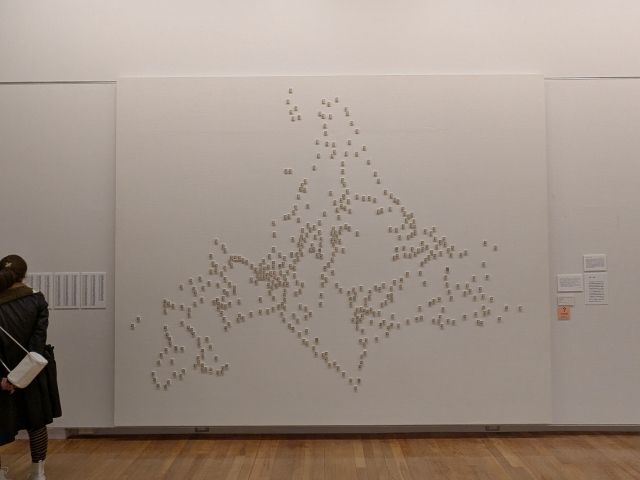切手と依頼文を各地の郵便局に送ると、指定した日時の消印を押して返送してもらえるという制度を上手く活用して、甥の一周忌に合わせて各局の消印を集めたものであるそう。作品のそばには、消印の郵便局が全て陳列されていました。