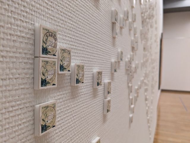 北海道を形成している「点」は、よく見ると全て消印の押された「切手」。道内各地の郵便局を表現したユニークな作品かなと思いきや、旅行が好きでありながらも病によってこの世を去ってしまった甥を思い完成させた作品とのこと。