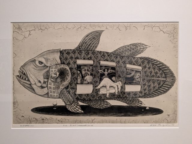 十勝出身の銅板画家による作品。めくれた体内には人や豚が見えるという、次元を超えた生物が描かれています。よく見ると、ウロコには一枚一枚目が描かれていたりと、細部まで目が離せません。