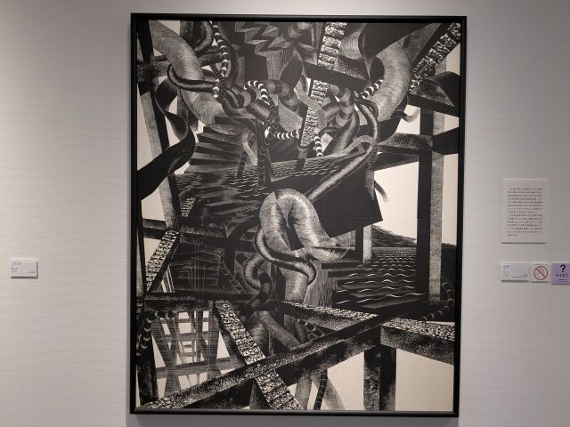 十勝出身の版画家による作品。エッシャーのようなねじれた世界にうねるのは不思議な管。からみつく姿は生命体のようですが、何の器官も見つけられません。有機物と無機物が混じり合っているように感じます。