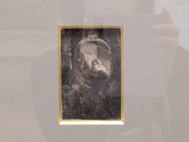 《夜警》などで知られるバロック期を代表するオランダの画家、レンブラントの版画作品。まずは暗い中に浮かぶ女性に目が行きますが、よく見ると影の中に男性がおり、女性はその対応をしています。さらによく見ると小さな子供たちが見えてきます。視点を誘導されているような感覚とともに、これはいったいどんなシーンなのか想像が膨らみます。女性は笑顔に見えるので、何か素敵なストーリーに感じてきました。
