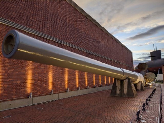 陸奥の引き揚げ品は、広島県呉市の大和ミュージアムにも展示されています。建物前の屋外展示エリアに並ぶのは陸奥の41センチ主砲身。こちらは呉の工場で製造されたもので、当時世界最大の艦載砲でした。
