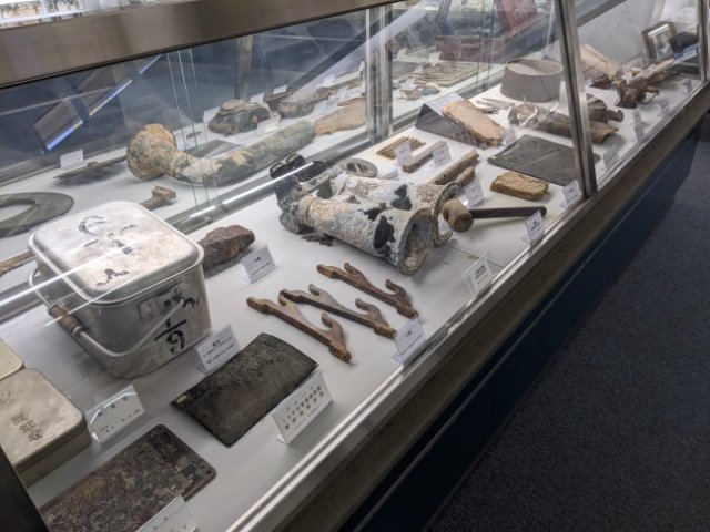 陸奥記念館には、そのときに引き揚げられたパーツや備品がずらりと並びます。並べられた引き揚げ品には、船の部品や軍用品に混じって、弁当箱や尺八などのアイテムも。