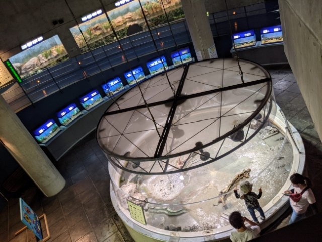 この水族館のメインはこちらの干潟水槽。直系5mほどの円形の水槽の中には、有明海の干潟が再現されており、干潟に暮らす生き物のリアルな動きを観察することができます。