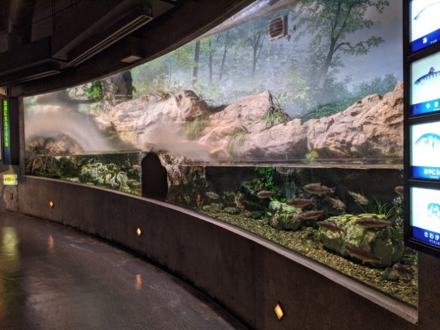 ニジマスやウグイが泳ぐ渓流水槽をはじめ、展示しているのは日本の淡水魚がメイン。