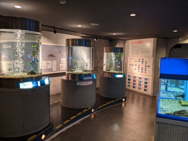 クサガメやイシガメのふれあい水槽、色鮮やかな淡水魚がそろう熱帯魚水槽などもあります。
