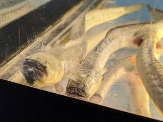 こちらの黒っぽいサカナはオヤニラミ。スズキ科の淡水魚で、エラに目玉のような模様が付いています。その特徴から「よつめ」とも呼ばれているそう。