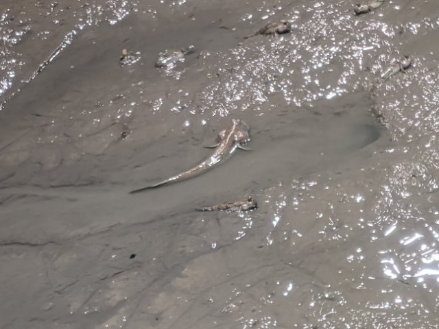 じっくり観察していると、泥に埋もれた巨大なトビハゼのような姿が見えてきます。このサカナこそがムツゴロウ。