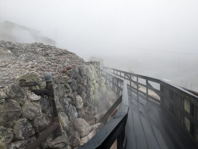湯の花小屋を出ると、蒸気が立ち込める温泉地帯が広がります。