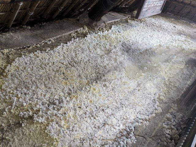 現在もここで湯の花が造られています。土間に温泉成分を含んだ青粘土を敷き詰め、地中から噴出する熱蒸気が浸透して結晶化することで湯の花ができあがっていくそう。この生産技術は2006年に国の重要無形民俗文化財にも指定されました。