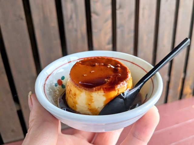 外のベンチで軽く食べられるもの・・・ということで頼んだのは名物の「地獄蒸しプリン」。苦味が効いたカラメルと、卵の濃厚な味わいが絶品です!