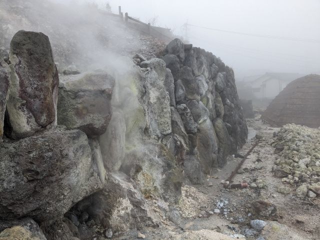 進んでいくと、江戸時代の明礬製造所跡もあります。積み上がった石の下には、噴気孔の断面が確認されたそうです。
