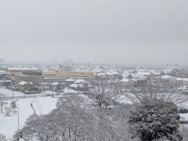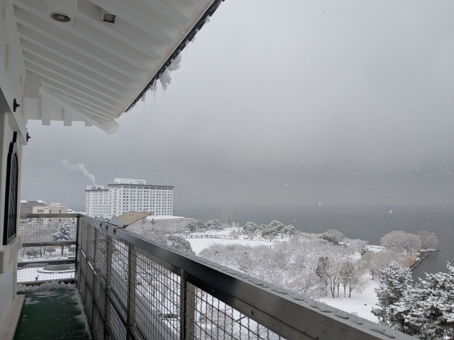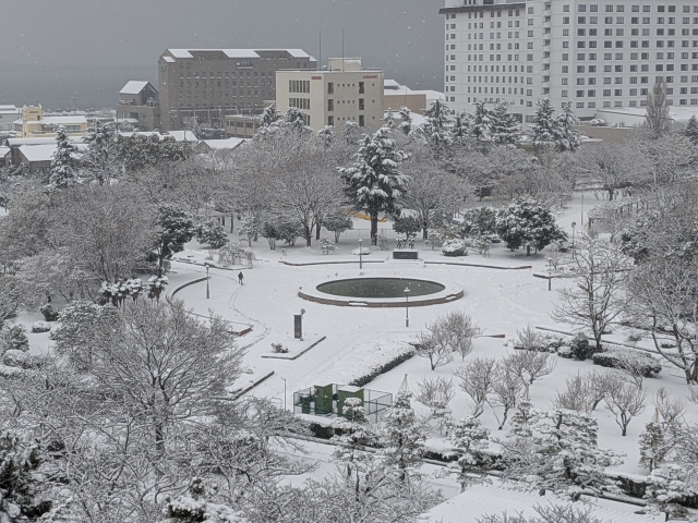 今回宿泊している「グランドメルキュール」の全貌も見えます。眼下には雪に埋もれた「豊公園」が広がっていました。