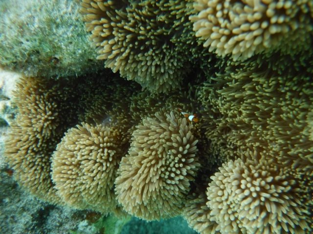 そろそろ魚のラインナップにも飽きてきたころ見つけたのは、小さな岩場。びっしりと並ぶイソギンチャクの影にはクマノミの姿が!