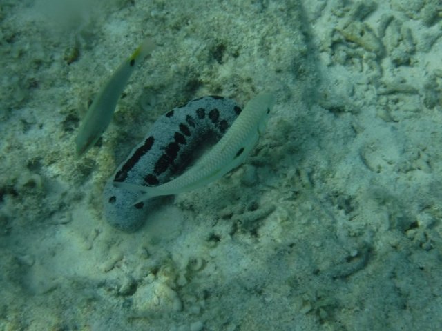 ここで気が付いたのですが、手を伸ばして指をこする仕草をすると、サカナが集まってきます!どうやら餌付けされているようで、ミツボシキュウセンがたっぷりと寄ってきました。エサは無いんだ、ごめんね。