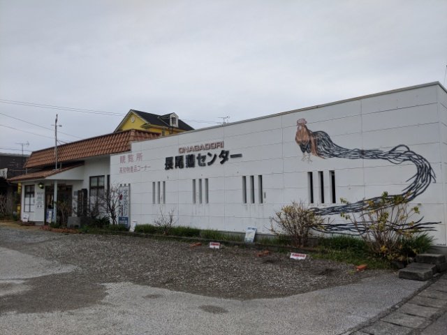 長尾鶏(おながどり)センターは、高知市の東に隣接する南国(なんこく)市にあります。高知駅から車で30分弱、国道55号線を走っていると白い壁に尾長鶏が描かれた建物が見えてきます。