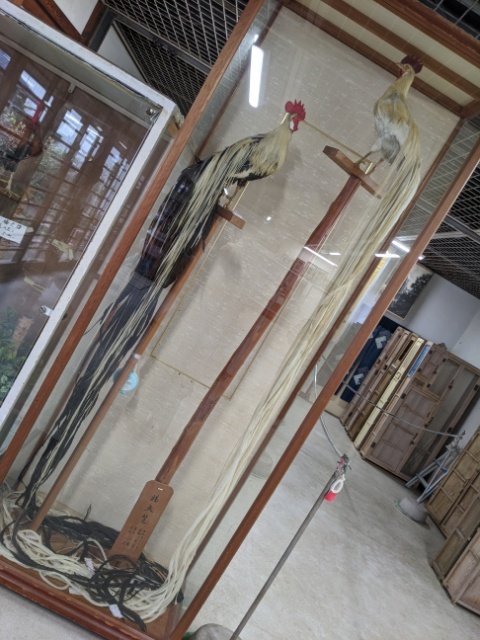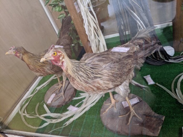尾が伸びるのは雄鶏だけ。雌鶏の剥製もあるのですが、普通のニワトリとあまり変わらないように感じます。