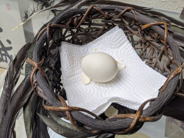 こちらは長尾鶏のタマゴ。年間300個タマゴを産むといわれている卵用種のニワトリとは大きく異なり、春先にしか産みません。
