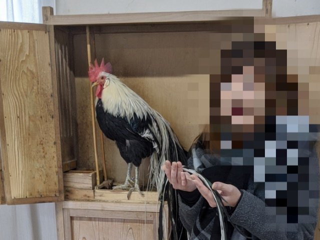 しばらく解説が続いたあと、箱を開けて実際に生きている長尾鶏を見せてもらいました。