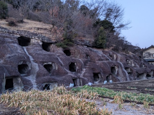 横穴はぎっしりと集まっているため、面積は想像よりもずっとコンパクト。ひと目で全貌が見渡せるため、見学だけなら5分もかかりません。