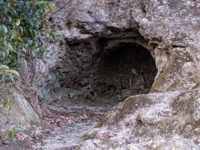 国道の傍らにひっそりとたたずむ遺跡。穴だらけの外観はインパクト抜群。かつては古墳として造営されたといわれるこの横穴には、弘法大師こと空海や百目鬼という妖怪など、様々な伝説が残されています。