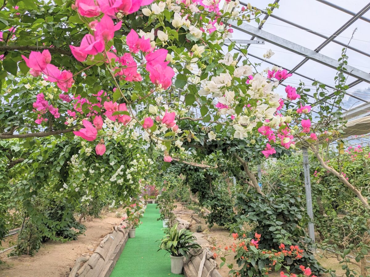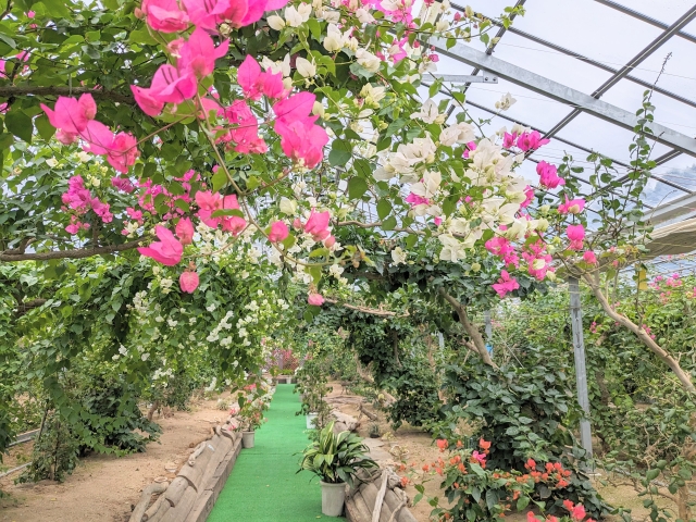 さて、島内を進んで行くと、ブーゲンビリアの丘というスポットが見えてきます。ここは2017年にオープンした観光温室。白、赤、黄、ピンクなど約30種類 170本ほどのブーゲンビリアを見ることができます。入園料がかかる時期もあるようですが、訪問した11月は無料開放中でした。