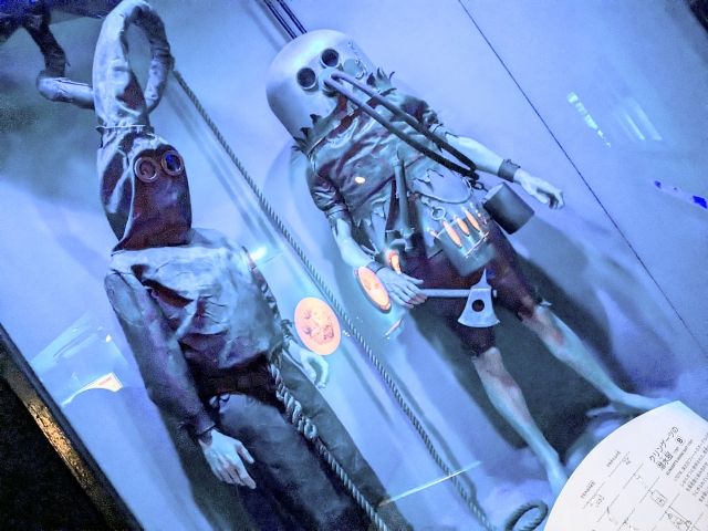 左側がディエゴ・ウファノの潜水服、右側がクリンゲーツの潜水服。どちらもチューブを通して空気を送ることで、水中での活動を可能にするアイテムです。